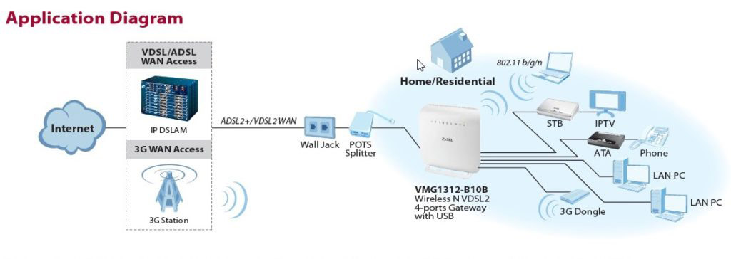 محصولات سری VMG1312-B زایکسل از دانگل USB 3G پشتیبانی میکنند،این امر قابلیت استفاده و به اشتراک گذاری اینترنت 3G را از طریق شبکه WAN و اینترنت DSL را فراهم میکند؛ با این حساب کاربران بدون نیاز به هیچ تنظیماتی قادر به انتخاب نوع اتصال دستگاه خود به اینترنت خواهند بود.